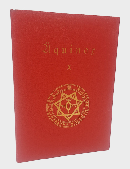 Äquinox X. Magie. Einige hauptsächliche Rituale: Grimorum Sanctissimum. / Liber XXV. / Der Sternrubin. / Liber XXXVI. / Der Sternsaphir. / Liber V vel Reguli. / Instruktion zu Liber V. Verlag Psychosophische Gesellschaft in der Schweiz, Stein AR. März 1959. S. [3]-42, 4 Bl. Gedruckt auf Werkdruck. OKunstleder Bd. (rot) m. Goldpr. u. OUmschlag.