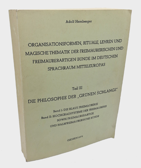 Hemberger, Adolf: Die Philosophie der Grünen Schlange. Band I: Die blaue Freimaurerei. Band II: Hochgradsysteme der Freimaurerei sowie freimaurerartige und halbfreimaurerische Bünde. (beide Teile in einem Band). Selbstverlag (Privatdruck) des Verfassers, Giessen 1973. 4°. 6 Bl., 387 S. OKarton.