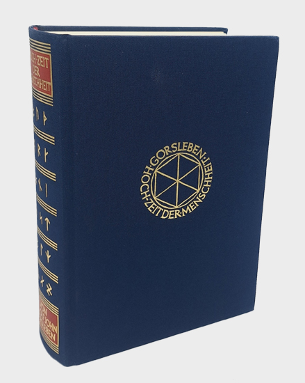 Gorsleben, Rudolf John: Hoch-Zeit der Menschheit. Das Welt-Gesetz Der Drei Oder Entstehen – Sein – Vergehen in Ursprache – Urschrift – Urglaube. Aus Den Runen Geschöpft. Faksimile-Verlag, Bremen 1993. Mit montiertem farbigem Frontispiz und zahlr. Abbildungen. XXV, 1 Bl., 764 S., 1 Bl. Vlgs.-Hinw. OLwd. mit reicher Goldprägung u. OUmschlag.