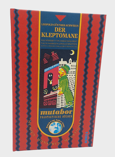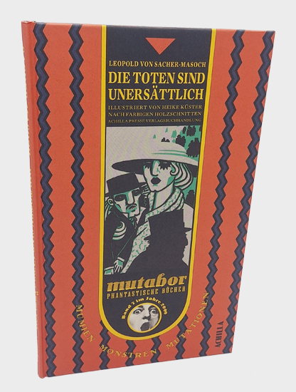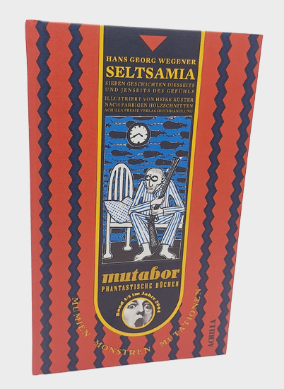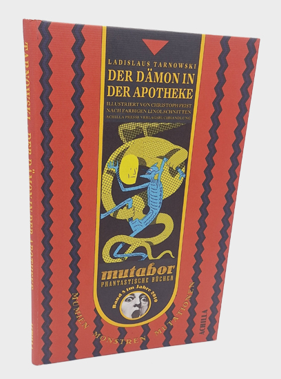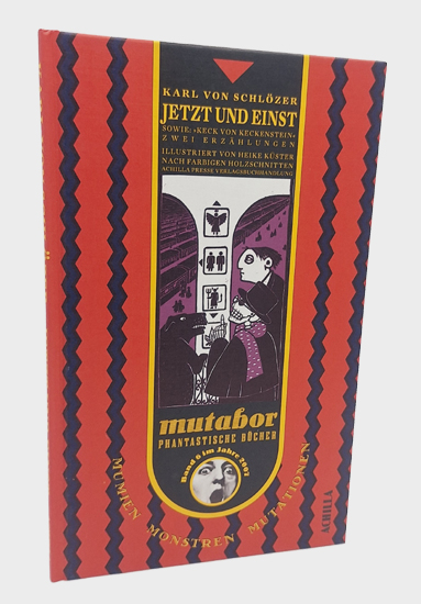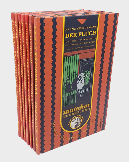 mutabor Phantastische Bücher (Mumien, Monstren, Mutationen). Band 1-8. – Band 1 (2001): Franz Kreidemann: Der Fluch. Illustriert von Heike Küster nach farbigen Holzschnitten. 37, [1] S., 1 Bl. Entnommen aus dem Band „Pans Marionettenspiel. Seltsame Liebesgeschichten“, 1921. (vgl. Bloch 1788). – Band 2 (2001): Arno Hach: Die Menschenhaut. Aquarelliert von Jörg Kleinschmidt. 39, [1] w. S. Entnommen aus dem Band „Der Kopf des Maori“, Dresden 1919. (vgl. Bloch 1316). – Band 3 (2002): Leopold Günther Schwerin: Der Kleptomane. Illustriert von Christoph Feist nach farbigen Linolschnitten. 38 S., 1 (w) Bl. Entnommen aus dem Band „Wahr oder Wahn?“, 1920. – Band 4/5 (2004): Hans Georg Wegener: Seltsamia. Sieben seltsame Geschichten diesseits und jenseits des Gefühls. Illustriert von Heike Küster nach farbigen Holzschnitten. 80 S. Die Originalausgabe erschien 1919 in Freiburg. (vgl. Bloch 3328). – Band 6 (2007): Karl von Schlözer: Jetzt und einst! Zukunftsmusik. (vgl. Bloch 2767). Sowie: „Keck von Keckenstein, danse macabre“. Illustriert von Heike Küster nach farbigen Holzschnitten. 38 S., 1 Bl. Originalausgabe der verwendeten Erzählungen „Aus Dur und Moll“, 1885. – Band 7 (2009): Leopold von Sacher-Masoch: Die Toten sind unersättlich. Illustriert von Heike Küster nach farbigen Holzschnitten im Offsetdruck reproduziert. 42 S., 1 Bl. Die Originalausgabe der verwendeten Erzählungen ist dem Band „Galizische Geschichten“, 1875, entnommen. – Band 8 (2010): Tarnowski, Ladislaus: Der Dämon in der Apotheke. Illustriert von Christoph Feist nach farbigen Linolschnitten im Offset reproduziert. 52 S. Entnommen dem 3. Band: Waldteufel. Gespenstergeschichten und Geistersagen von Ladislaus Tarnowski. Grünberg: Levysohn & Siebert 1842. (vgl. Bloch 3095). – Sieben nahezu neuwertige Exemplare, augenscheinlich ungelesen. Komplett selten.