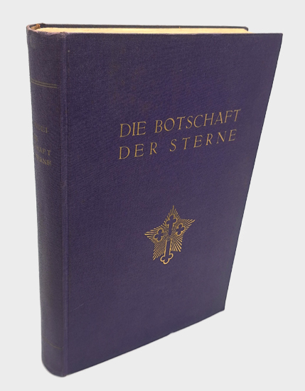 Heindel, Max [Pseudonym] = Carl Louis Fredrik Heindl / Graßhoff: Die Botschaft der Sterne. Theosophisches Verlagshaus, Leipzig o.J. [1928]. II. Auflage. Gr.-8°. Einzig autorisierte Übersetzung, von Rudolf von Sebottendorf. Verbessert und vervollständigt durch Dr. phil. Gerhard Naumann. IV, 422 S. [S. 417-421 Anmerkungen zur II. deutschen Auflage], 3 Bl. Vlgs.-Anz. Lila OLwd. mit Goldprägung.