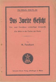 Neidhart, A.: Das Zweite Gesicht. Vor- und Fernschau zukünftiger Ereignisse. Ein Blick in die Tiefen der Seele. Pfullingen in Württemberg, Johannes Baum Verlag [ohne Jahr, ca. 1924]. 23 S., 4 Bl. Vlgs.-Anz. OBrosch.