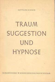 Schmid, Gottlob: Traum, Suggestion und Hypnose. Eine aus der Beobachtung von Schlafträumen, Wachtraumbildern und Schlummerbildern erwachsene Theorie vom Traume, von der Suggestion und der Hypnose. Esslingen, Burgbücherei W.Schneider 1957. 219 S., 1 Bl. OKart.