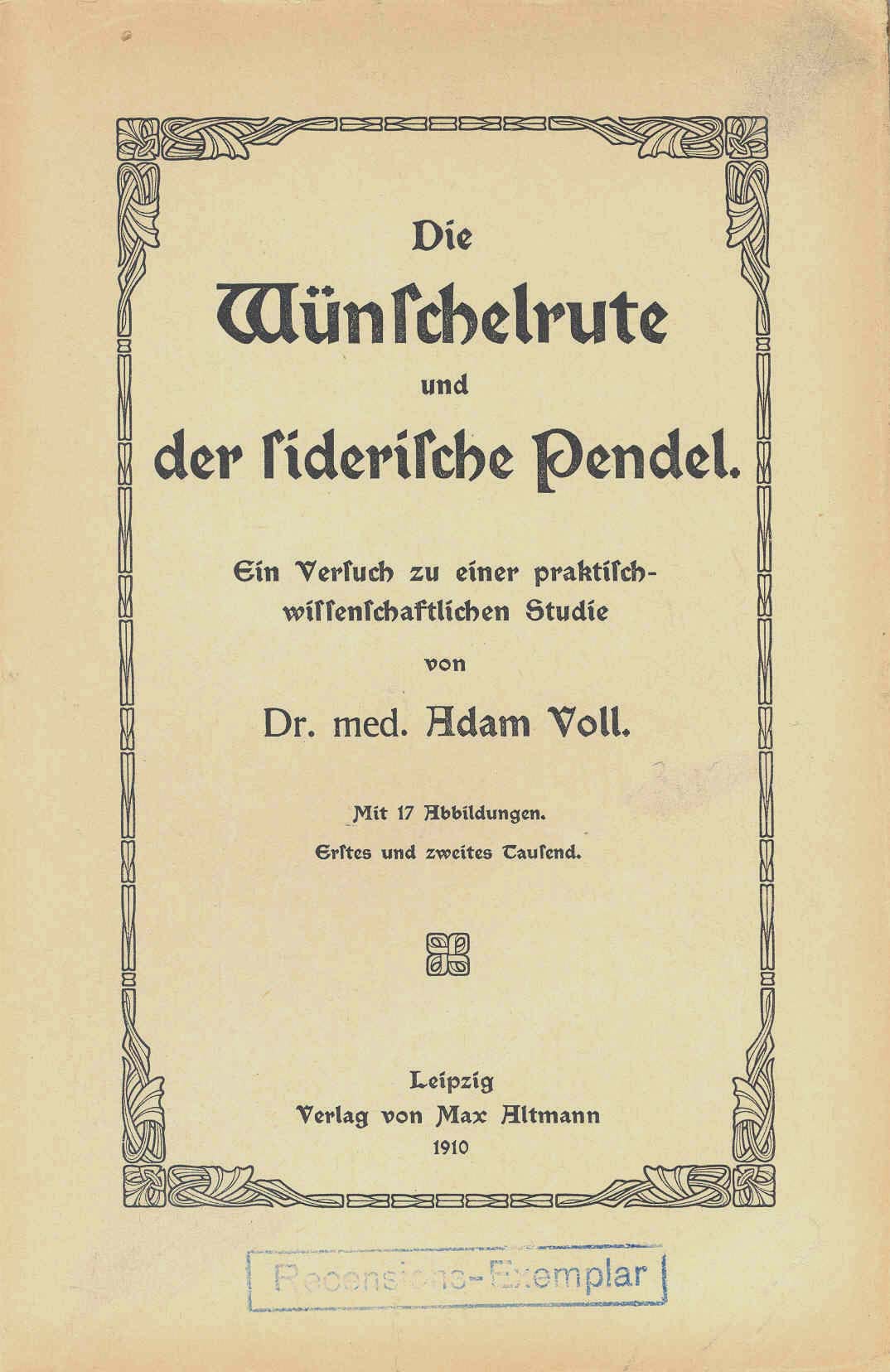 Voll, Dr. med. Adam: Die Wünschelrute und der siderische Pendel. Ein Versuch zu einer praktisch-wissenschaftlichen Studie. Leipzig, Max Altmann 1910. 1. u. 2.Tsd. Mit 17 Abb. 4 Bl., 112 S., 4 Bl. OKart.