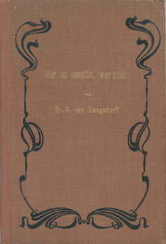 Langsdorff, Dr. med. G(eorg) von: Wer ist sensitiv, wer nicht? oder kurze Anleitung, sensetive Menschen mit Leichtigkeit zu finden. Auszug aus Karl freiherrn v. Reichenbach´s Schriften Über “Sensitivität”, “Od” und “Dynamide” nebst Einführung in die wunderbare Dr. Fezek´schen Entdeckung von der bisher falschen Vorstellung des Blutkreislaufes. Verlag von Wilhelm Besser, Leipzig 1900. VII, 61 S., 5 Bl. goldgep. OLwd.