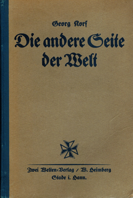 Korf, Georg: Die andere Seite der Welt. Metaphysischer Roman. Zwei Welten Verlag (W. Heimberg), Stade i. Hann. 1921. Vierte Auflage (4. bis 6. Tausend) 4 Bl., 241 S., 1 Bl. OHLwd.