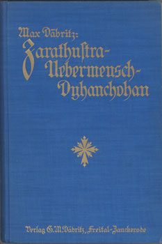 Zarathustra- Übermensch- Dyhanchohan. G. M. Däbritz Verlag, Freital-Zauckerode bei Dresden o.J. (um 1925). 1. bis 6. Tausend. 254 S., 1 Bl. goldgepr. OLwd. (Feinleinen).