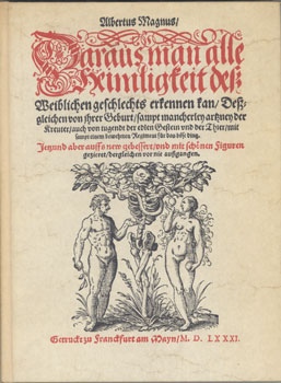 Albertus Magnus: Daraus man alle heimligkeit erkennen kan/ Deßgleichen von ihrer Geburt/ sampt mancherley artzney der Kreuter/ auch von tugendt der edelen Gestein und der Thier/ mit sampt einem bewehrten Regiment für das böse ding. Jetzund aber auffs new gebessert/ und mit schönen Figuren gezieret/ dergleichen vor nie außgangen. S. Fischer Verlag, Frankfurt/M 1977. 151 S., 2 Bl.OPp. (illustr. Pergamentpapierüberzug).