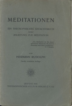 Rudolph, Hermann: Meditationen. Ein Theosophisches Andachtsbuch nebst Anleitung zur Meditation. Theosophischer Kultur-Verlag, Leipzig 1916. Zweite, erweiterte Auflage. VIII, 101 S., 2 Bl. OKart.