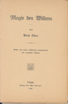 Shou, Peryt (Ps.) = Albert Christian Georg Schultz Magie des Willens. Verlag Max Altmann, Leipzig 1920. Dritte und vierte vollständig umgearbeitete und vermehrte Auflage. 88 S. OBrosch.