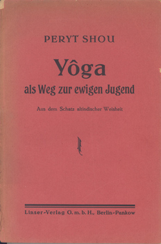Shou, Peryt (Ps.) = Albert Christian Georg Schultz Yoga als Weg zur ewigen Jugend. Aus dem Schatz altindischer Weisheit. Linser-Verlag, Berlin-Pankow 1924. Mit 5 Textfig. u. Buchschmuck. 159 S. rote OBrosch.