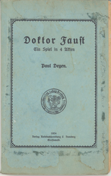 Degen, Paul (d.i. Margarethe Paul): Doktor Faust. Ein Spiel in 4 Akten. Verlag Ratsbuchhandlung L. Bamberg, Greifswald 1924. 74 S. OKart.