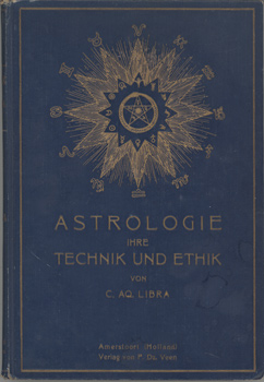 Libra, C. Aq. (Ps.) = Roelf Takens: Astrologie. Ihre Technik und Ethik. P. Dz. Veen, Amersfoort (Holland) 1922. Gr.-8°. 3. revidierte Auflage. Aus dem Holländischen übersetzt. Mit Textab. u. 1 Karte. 1 Bl., 1 Karte (″Alte Astro-Geographische Weltkarte”), 3 Bl., 296 S. blauer goldgepr. OLwd.