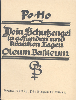 Po-Ho. Dein Schutzengel in gesunden und kranken Tagen. Oleum Basileum als Krankheitsfeind. Über Wesen, Wirkung und Anwendung des Basler Heilöls. Ein Gesundheitsbuch, zusammengestellt unter Verwendung vonForschungsmaterial der letzten fünf Jahre auf Grund eigener Beobachtungen sowie direkt erhaltener Berichte. Prana-Verlag, Pfullingen in Württ. o.J. (um 1920). Kl.-8°. 60 S., 2 Bl. OKarton.