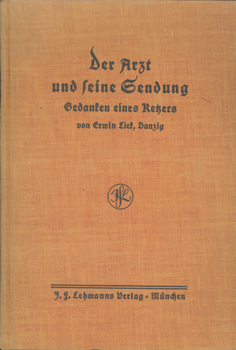 Liek, Erwin: Der Arzt und seine Sendung. Gedanken eines Ketzers. J. F. Lehmanns Verlag, München 1926. Zweite Auflage (4.-7. Tausend). 140 S., 6 Bl. Vlgs.-Anz. OLwd.