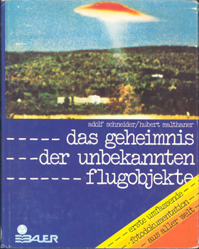 Schneider, Adolf u. Hubert Malthaner: Das Geheimnis der unbekannten Flugobjekte. Erste umfassende Fotodokumentation aus aller Welt. Hermann Bauer Verlag, Freiburg im Breisgau 1976. 279 S. OLwd. mit OUmschlag.