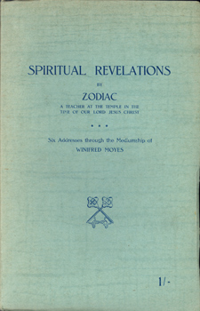 Moyes, Winifred: The Teachings of Zodiac. A Teacher at the Temple in the Time of our Lord Jesu Christ. Six Addresses through the Mediumship of Winifred Moyes. The Greater World Association, London o.J. (um 1935). 93 S., 1 Bl. OKarton.