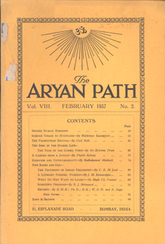 The Aryan Path. Vol. VIII. February 1937, No. 2. K. N. Panday, Theosophy Company, Bombay (India) 1937. Gr.-8°. S. 50 [49] bis S. 95 OKarton.