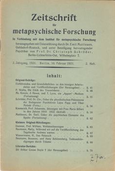 Zeitschrift für metapsychische Forschung. In Verbindung mit dem Institut für metapsychische Forschung. [Jahrgang 1931 (=2. Jg.), 2. Heft]. [Eigen] Verlag Prof. Dr. Christoph Schröder, Berlin Lichterfelde-Ost [16. Februar] 1931. Gr.-8°. Herausgegeben mit Unterstützung durch Dr. Emil Mattiesen [Gehlsdorf-Rostock]. S. 41 bis 72 OKarton.