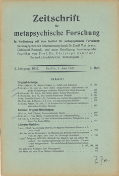 Zeitschrift für metapsychische Forschung. In Verbindung mit dem Institut für metapsychische Forschung. [Jahrgang 1931 (=2. Jg.), 6. Heft]. [Eigen] Verlag Prof. Dr. Christoph Schröder, Berlin Lichterfelde-Ost [7. Juni] 1931. Gr.-8°. Herausgegeben mit Unterstützung durch Dr. Emil Mattiesen [Gehlsdorf-Rostock]. S. 161 bis 200 OKarton.