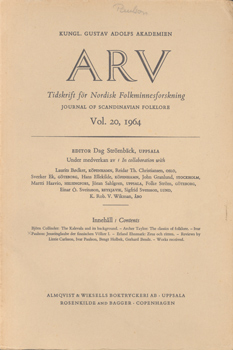 Strömbäck, Dag (Editor): ARV. Tidskrift för Nordisk Folkminnesforskning. Journal of Scandinavian Folklore. [Vol. 20]. Almqvist & Wiksells Boktryckeri, Copenhagen 1964. Gr.-8°. 211 S. OKarton.