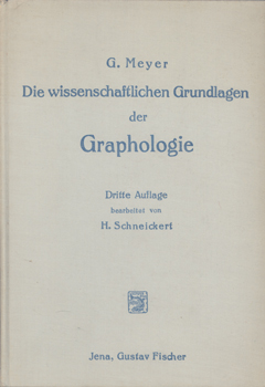 Meyer, Dr. Georg: Die wissenschaftlichen Grundlagen der Graphologie. Vorschule der gerichtlichen Schriftvergleichung. Verlag von Gustav Fischer, Jena 1940. Gr.-8°. Dritte Auflage bearbeitet und erweitert von Dr. Hans Schneickert. Mit 78 Abbildungen im Text. 166 S., 1 Bl. Vlgs.-Anz. OLwd.