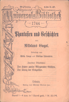 Gogol, Nikolaus: Phantasien und Geschichten. Zweites Bändchen. Verlag von Philipp Reclam jun., Leipzig o.J. 12°. Uebersetzt von Wilh. Lange und Philipp Löbenstein. 123 S., 2 Bl. Vlgs.-Anz. OBroschur.
