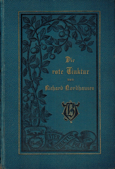 Nordhausen, Richard: Die rote Tinktur. Eine kuriose Geschichte. Verlag des Vereins der Bücherfreunde Schall & Grund, Berlin o.J. [1895]. 2 Bl. (Vortitel u. Titel), 503 S., 2 Bl. Vlgs.-Anz. Olwd. mit floralem Muster u. Goldpr. auf Rck.– u. Deckel.