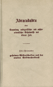 Abracadabra. Sammlung unbegreiflicher und außerordentlicher Geheimnisse aus älterer Zeit. Für Freunde geheimer Wissenschaften und der uralten Goldmacherkunst. Vollständiger, originalgetreuer Nachdruck der Ausg. Cöln o.J. Freiburg im Breisgau, Aurum Vlg. 1978. 2 Bl., 160 S. OKunstldr.