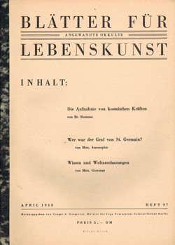 Blätter für angewandte okkulte Lebenskunst. April 1958 – [Heft 97]. Herausgegeben (als Privatdruck) von Gregor A. Gregorius. Meister der Loge Fraternitas Saturni Orient Berlin, Berlin 1958. 4°. 1 Bl. (Deckblatt m. Titel), 18 S. Typoskriptdruck mit Klammerheftung und Fälzelstreifen.