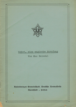 Heindel, Max: Gebet, eine magische Anrufung. Rosenkreuzer-Gemeinschaft, Deutsche Zentralstelle, Darmstadt o.J. [um 1960]. 14 S., 1 (w) OBroschur.