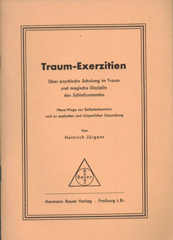 Jürgens, Heinrich: Traum-Exerzitien. Über psychische Schulung im Traum und magische Disziplin des Schlafzustandes. Neue Wege zur Selbsterkenntnis und zu seelischer und körperlicher Gesundung. Hermann Bauer Verlag, Freiburg im Breisgau 1953. 3. Auflage. 38 S., 1 Bl. Vlgs.-Anz. OKarton.