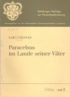Greiner, Karl: Paracelsus im Lande seiner Väter. Selbstverlag der Intern. Paracelsusgesellschaft, Salzburg 1961. 48 S. OKarton.