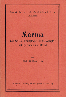 Schneider, Rudolf: Karma das Gesetz des Ausgleichs, der Gerechtigkeit und Harmonie im Weltall. Renatus-Verlag, Lorch Wurttemberg, 1949. 2. Auflage. 30 S., 1 Bl. OBroschur.