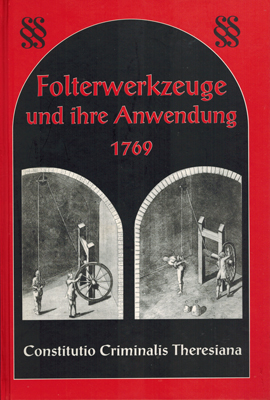 Constitutio Criminalis Theresiana. Folterwerkzeuge und ihre Anwendung 1769. Tafeln und erläuternde Texte. Reprint Verlag Leipzig, Holzminden 2000. 4°. 8 Bl., LVI illustr. OPp.