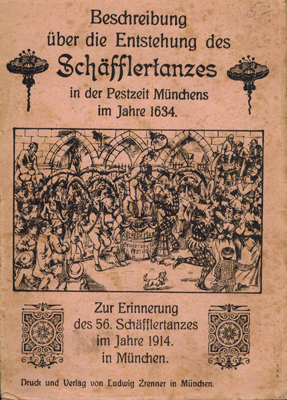 Beschreibung über die Entstehung des Schäfflertanzes in der Pestzeit Münchens im Jahre 1634. Druck und Verlag Ludwig Zrenner, München 1914. 8 S. illustr. OBroschur.