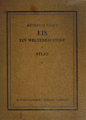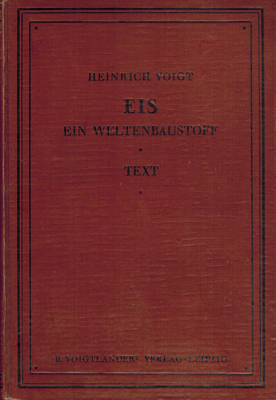 Voigt, Dr. Heinrich: Eis. Ein Weltenbaustoff. Gemeinfaßliche Einführung in Hörbigers Glazialkosmogonie (Welteislehre) mit einem Atlas. (Textband und Atlas = 2 Bde.). R. Voigtländer Verlag, Leipzig 1928. Dritte erweiterte und verbesserte Auflage. Textband: XV, 316 S. gepr. OLwd.; Atlas: 4°. 2 Bl., 18 (davon 16 doppelblattgr.) Tafeln mit teilw. farb. Figuren und Texterläuterungen. OHLwd.