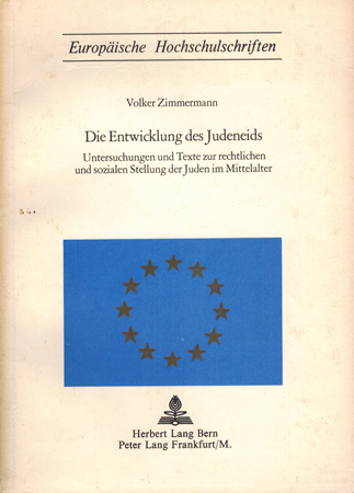 Zimmermann, Volker: Die Entwicklung des Judeneids. Untersuchungen und Texte zur rechtlichen und sozialen Stellung der Juden im Mittelalter. Herbert u. Peter Lang, Bern u. Frankfurt 1973. 6 Bl., 273 S., 1 Bl. illustr. OKarton.