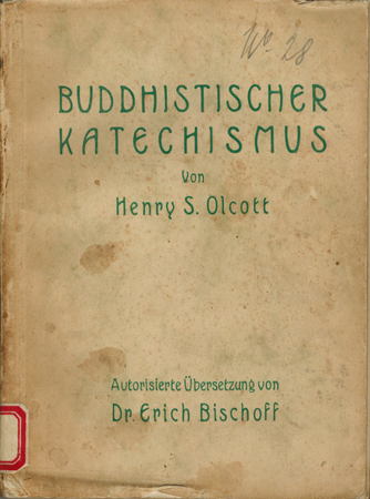 Olcott, Henry S[teel]: Der Buddhistische Katechismus. Th. Grieben’s Verlag (L. Fernau), Leipzig 1906. 36. (3. deutsche) Ausgabe mit besonderem Vorwort des Verfassers und 8 Illustrationen. Autorisierte Übersetzung (u. Vorwort) nebst Anmerkungen, Kanontafel und Glossar von Dr. Erich Bischoff. VII, 1 Bl., 151 S. OKarton.