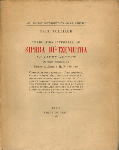 Traduction Intégrale du Siphra Di-Tzeniutha, Le Livre Secret. Ouvrage essentiel du Sepher Ha-Zohar: II, F° 176b-179a. Émile Nourry, Paris 1930. Gr.-8°. 213 S., 2 Bl., 1 (w) OKarton.