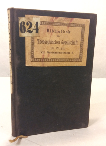 Exemplar aus der Bibliothek der Theosophischen Gesellschaft in Wien, eingebunden in den üblichen sehr stabilen u. robusten schwarzen Leineneinband mit Dck.– u. Rck.– Schild. – Einband leicht berieben, sonst ein gutes Exemplar.