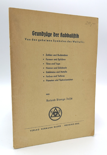 Jossé, Roland Dionys: Grundzüge der Kabbalistik. Von den geheimen Symbolen des Weltalls: Zahlen und Buchstaben, Formen und Sphären, Töne und Tage, Namen und Schicksale, Edelsteine und Metalle, Farben und Tattwas, Planeten und Tierkreiszeichen. Verlag Hermann Bauer, Freiburg i. Br. 1950. 40 S. OKarton.