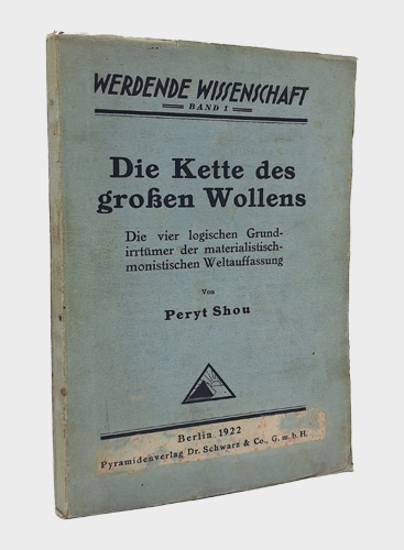 Shou, Peryt (Ps.) = Albert Christian Georg Schultz: Die Kette des großen Wollens. Die vier logischen Grundirrtümer der materialistisch-monistischen Weltauffassung. Pyramidenverlag Dr. Schwarz & Co. G.m.b.H., Berlin 1922. Mit 7 Textfiguren und 2 Tabellen. VIII, 156 S. OKarton.