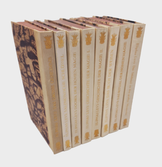 Levi, Eliphas [Pseudonym] = Abbé Alphonse Louis Constant: Das Gesamtwerk. Herausgegeben von Fritz Werle. 8 Bände. Otto Wilhelm Barth Verlag, Wien – München-Planegg – Leipzig [6. Band: nur München-Planegg] 1925-28. – [1. Band]: Das große Geheimnis. 1925. Mit 2 Textfiguren. 243 S., 1 Bl. [Inhaltsverzeichnis], 1 w. Bl. – [2. & 3. Band]: Geschichte der Magie. 2 Bände. 1926. Erster Halbband. Mit 12 ganzseitigen Textabbildungen. 294 S., 1 w. Bl. Zweiter Halbband. Mit 4 ganzseitigen Textabbildungen. 252 S., 2 w. Bl. – [4. & 5. Band]: Dogma und Ritual der Hohen Magie. 2 Bände. 1927. Erster Band: Dogma. Mit 4 ganzseitigen Abbildungen im Text, 5 [1 wiederholten] Textabbildung und einigen kleinen Diagrammen im Text. 272 S. Zweiter Band: Das Ritual. Mit 5 ganzseitigen Abbildungen im Text, 17 Textabbildungen [davon 7 magische Quadrate] und einigen kleinen Diagrammen im Text. 341, [1] S., 1 w. Bl. – [6. Band]: Die salomonischen Schlüssel. 1927. Mit 91 Textfiguren. 94 S., 1 Bl. – [7. Band]: Das Buch der Weisen. 1928. Mit 2 Tafeln [Bildnisse Levis]. 237 S., 1 Bl. [Inhaltsverzeichnis]. – [8. Band]: Der Schlüssel zu den großen Mysterien nach Henoch, Abraham, Hermes Trismegistos und Salomon. 1928. Mit 7 Textabbildungen und einigen kleinen Diagrammen im Text. 392 S., 1 Bl., 1 w. Bl. OHalbpergament-Bände mit goldgeprägtem Rückentitel.