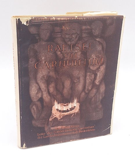 Kreuz, Franz: Rätsel um Carnuntum. Druck und Verlag: Landeshauptmannschaft, Niederdonau [1939]. Verfaßt und zusammengestellt vom Leiter des Sonderdienstes Carnuntum der Landeshauptmannschaft Niederdonau. 50 zum Teil farbige Kunstdruckblätter und einer Karte. 100 S., 2 Bl., 50 Bl. Tafeln. OLwd. mit OUmschlag.