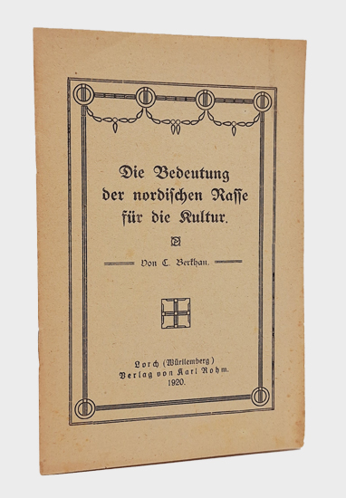 Berkhan, C.: Die Bedeutung der nordischen Rasse für die Kultur. Verlag von Karl Rohm, Lorch (Württemberg) 1920. 15 S. OBroschur.