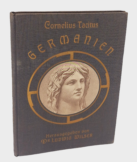 Tacitus, Cornelius: Germanien. Herkunft, Heimat, Verwandschaft und Sitten seiner Völker. Verlag von Peter Hobbing, Steglitz 1915. Neu übersetzt, mit Erläuterungen in Wort und Bild herausgegeben von Dr. Ludwig Wilser. Mit vielen Abbildungen nach zeitechten Kunstwerken und Funden, sowie einer Völkerkarte. XV, 3 Bl., 48 S., 4 Bl. OLwd. mit montiertem Bildnis u. Goldprägung.