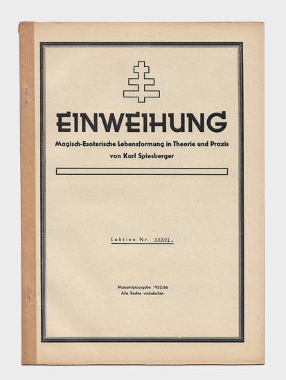 Einweihung. Magisch-esoterische Lebensformung in Theorie und Praxis. Lektion Nr. XXXVI. Privatdruck / Manuskriptausgabe o.O., 1952/58. 4°. 1 Bl., 14 S. Typoskriptdruck mit Klammerheftung und Fälzelstreifen.