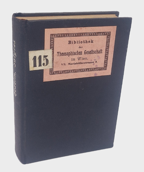 Première édition. Édition unique à cing cents exemplaires. – Exemplaire de la bibliothèque de la Société Théosophique de Vienne, relié dans la reliure habituelle en toile noire très stable et robuste. – Couverture légèrement frottée et légèrement abîmée. Un bon exemplaire de la très rare première édition.