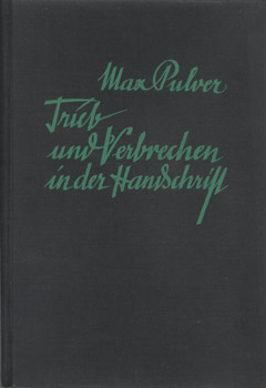 Pulver, Max: Trieb und Verbrechen in der Handschrift. Ausdrucksbilder asozialer Persönlichkeiten. Orell Füssli Verlag, Zürich 1948. Gr.-8°. Fünfte, bearbeitete Auflage. Mit 36 Abbildungen. (36 Handschriftenproben auf Tafeln) 4 Bl., 238 S., 1 Bl. OLwd.